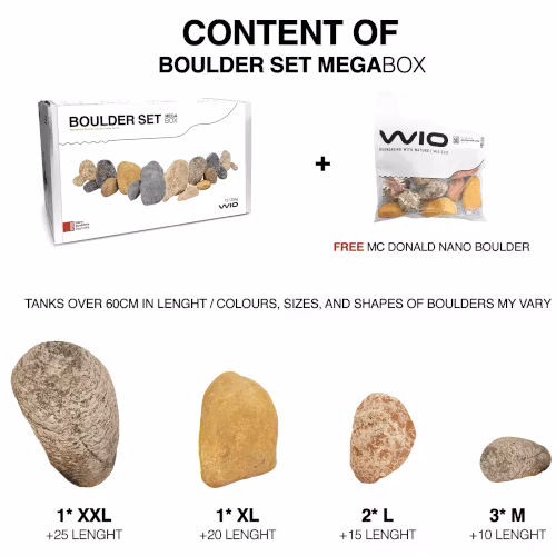 Komplett megakit med stenar - Mcdonald lake boulderInnehåller:1 st XXL (25+ cm)1 st XL (20+ cm)2 st L (15+ cm) 3 st M (10+ cm)1 st påse med nano stenar... Läs mer