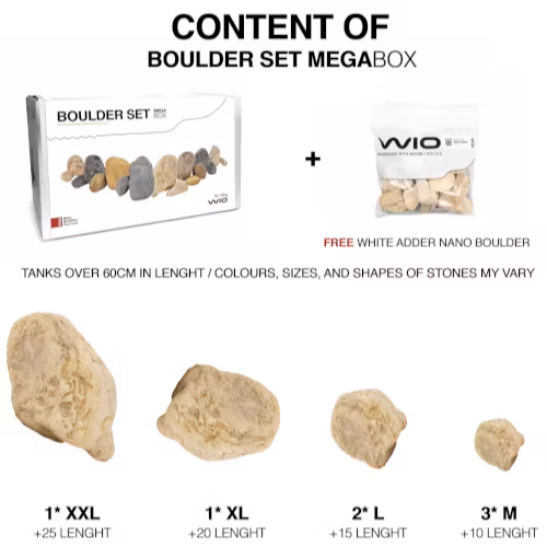 Komplett megakit med stenar - White AdderInnehåller:1 st XXL (25+ cm)1 st XL (20+ cm)2 st L (15+ cm) 3 st M (10+ cm)1 st påse med nano stenar... Läs mer